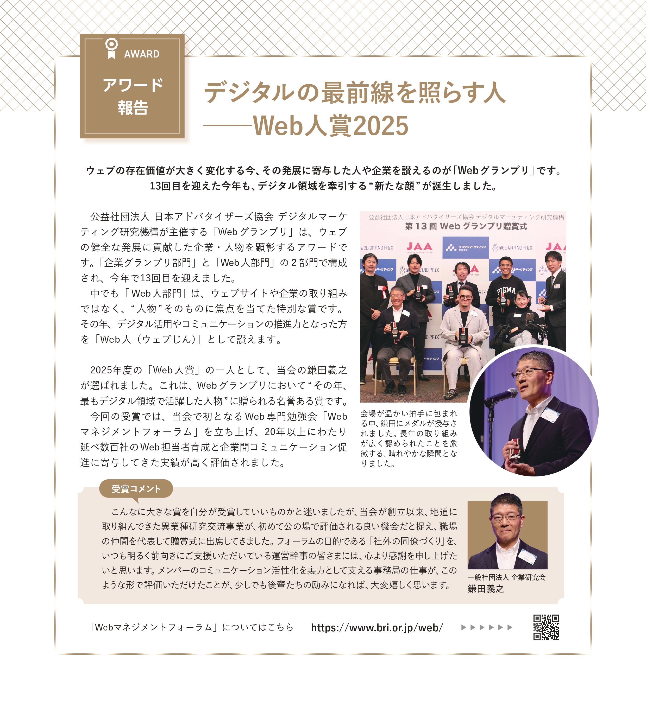 2025年度の「Web 人賞」の一人として、当会の鎌田義之が選ばれました。これは、Webグランプリにおいて“その年、最もデジタル領域で活躍した人物”に贈られる名誉ある賞です。 今回の受賞では、当会で初となるWeb 専門勉強会「Webマネジメントフォーラム」を立ち上げ、20年以上にわたり延べ数百社のWeb担当者育成と企業間コミュニケーション促進に寄与してきた実績が高く評価されました。